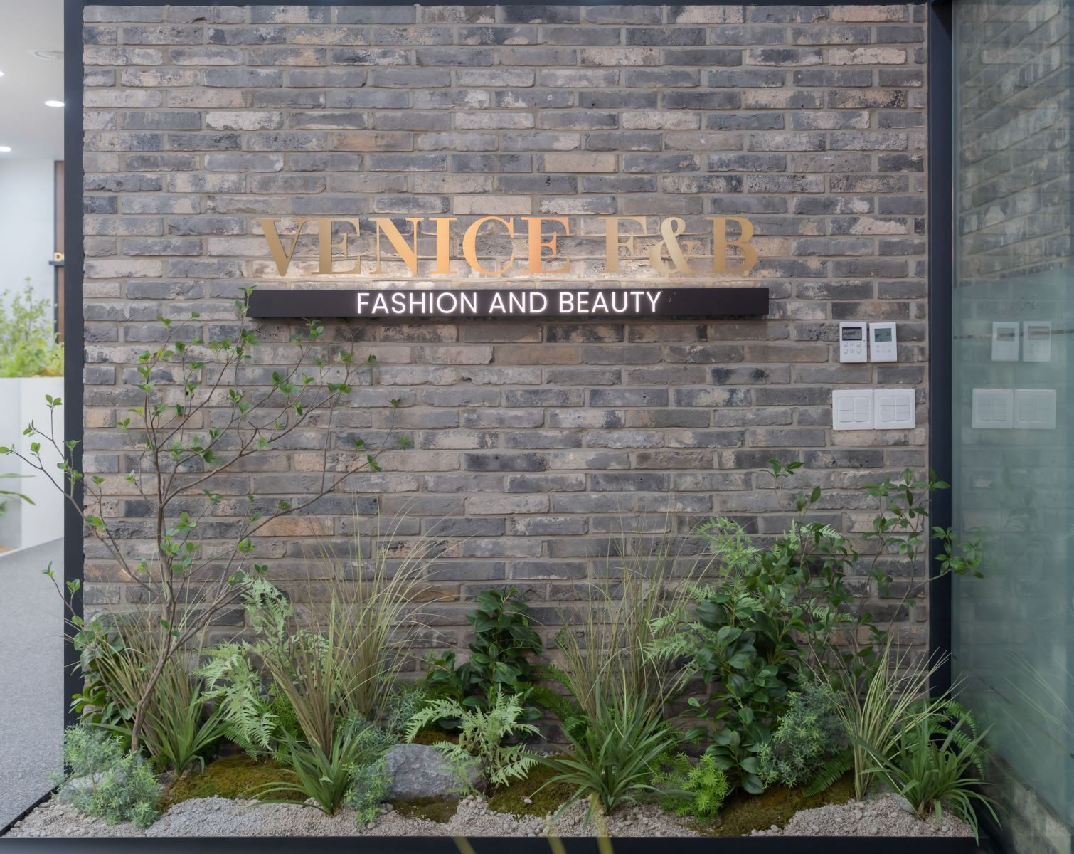 Mẫu tiểu cảnh cây giả thường được bố trí sát tường, kết hợp hài hòa giữa các loại cây lá xanh, bụi cỏ trang trí, dương xỉ, đá tự nhiên và sỏi trắng. Sự phối hợp giữa chiều cao – thấp, đậm – nhạt tạo nên tổng thể sinh động nhưng vẫn gọn gàng và tinh tế. Khi đặt dưới bảng logo hoặc mảng tường trang trí, tiểu cảnh giúp không gian bớt khô cứng, tăng tính thẩm mỹ và tạo chiều sâu cho thiết kế nội thất.
